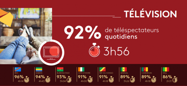 Dans les grandes lignes, cette étude montre qu’en 2019, 92 % des Africains sondés ont regardé la télévision quotidiennement durant en moyenne 3h56, soit quatre minutes de moins qu’en 2018. 62 % d’entre eux ont écouté la radio quotidiennement, pendant une durée moyenne de 1h29.